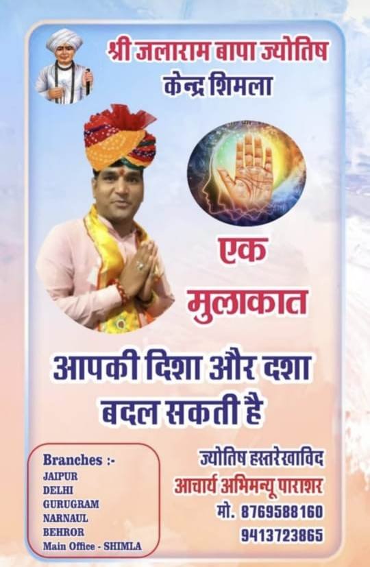अपने जीवन की साधना और विद्या को समाज के कल्याण हेतु समर्पित करते हुए अभिमन्यू जी ने “श्री जलाराम बापा ज्योतिष समाधान केंद्र, शिमला (रजि.)” की स्थापना की।