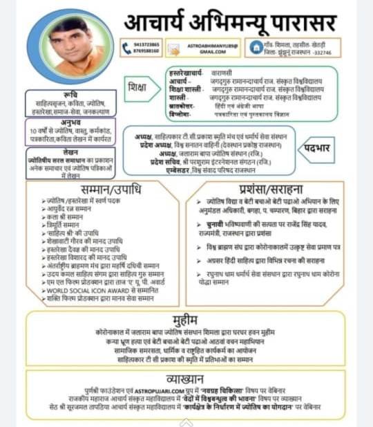 राजस्थान की पवित्र धरती झुंझुनूं ज़िले के खेतड़ी तहसील के गाँव शिमला में जन्मे ज्योतिषाचार्य अभिमन्यू पाराशर आज उस ऊँचाई पर हैं जहाँ से उनकी पहचान न केवल भारत में, बल्कि अंतरराष्ट्रीय स्तर पर एक विद्वान, ज्योतिषाचार्य, साहित्यकार और समाजसेवी के रूप में की जाती है।